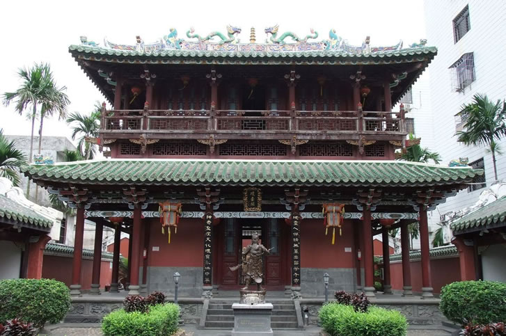 府城鼓樓位于府城鼓樓街,原名譙樓,又稱文明樓。始建于明洪武五年(1372年),明清兩代多次重修。臺基為明成化十七年(1481年)擴(kuò)建而成,長28米,寬24米,高6.39米。兩拱門,寬4.6米,高7.1米,門額分刻“海南壯觀”、“奇甸文明”,F(xiàn)存鼓樓為清乾隆五十三年(1788年)重修,坐北朝南,面闊五間19.9米,進(jìn)深三間9.95米,高7.56米,歇山頂,脊飾二龍朝日。樓內(nèi)原有明正統(tǒng)元年(1436年)銅禁鐘一口,鐘銘記述了捐資鑄鐘情況及祈求國泰民安之意,現(xiàn)存五公祠。