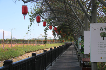 五色長廊長達(dá)200米,利用原生態(tài)爬藤類植物打造而成,炮仗花、使君子、百香果長年環(huán)繞于長廊頂,四季花開、碩果累累、香飄四溢,長廊腳基處龍船花爭先斗艷,形成了一座天然文化欣賞景觀。