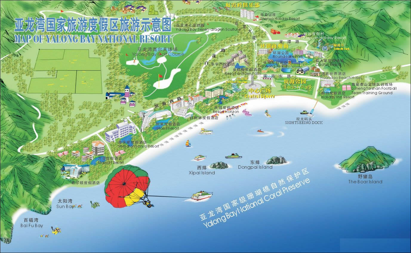 這里三面青山相擁,南面月牙型向大海敞開。除陽(yáng)光、海水、沙灘俱佳外,尚有奇石、怪灘、田園風(fēng)光構(gòu)成了各具特色的風(fēng)景。錦母角、亞龍角激浪拍崖,怪石嶙峋,是攀崖探險(xiǎn)活動(dòng)的良好場(chǎng)所。海面上以野豬島為中心,南有東洲島、西洲島,西有東排、西排,可開展多種水上運(yùn)動(dòng)。亞龍灣中心廣場(chǎng)有高達(dá)27米的圖騰柱,圍繞圖騰柱是三圈反映中國(guó)古代神話傳說(shuō)和文化的雕塑群。廣場(chǎng)上,四個(gè)白色風(fēng)帆式的尖頂帳篷,給具有古老文化意蘊(yùn)的廣場(chǎng)增添了現(xiàn)代氣息。