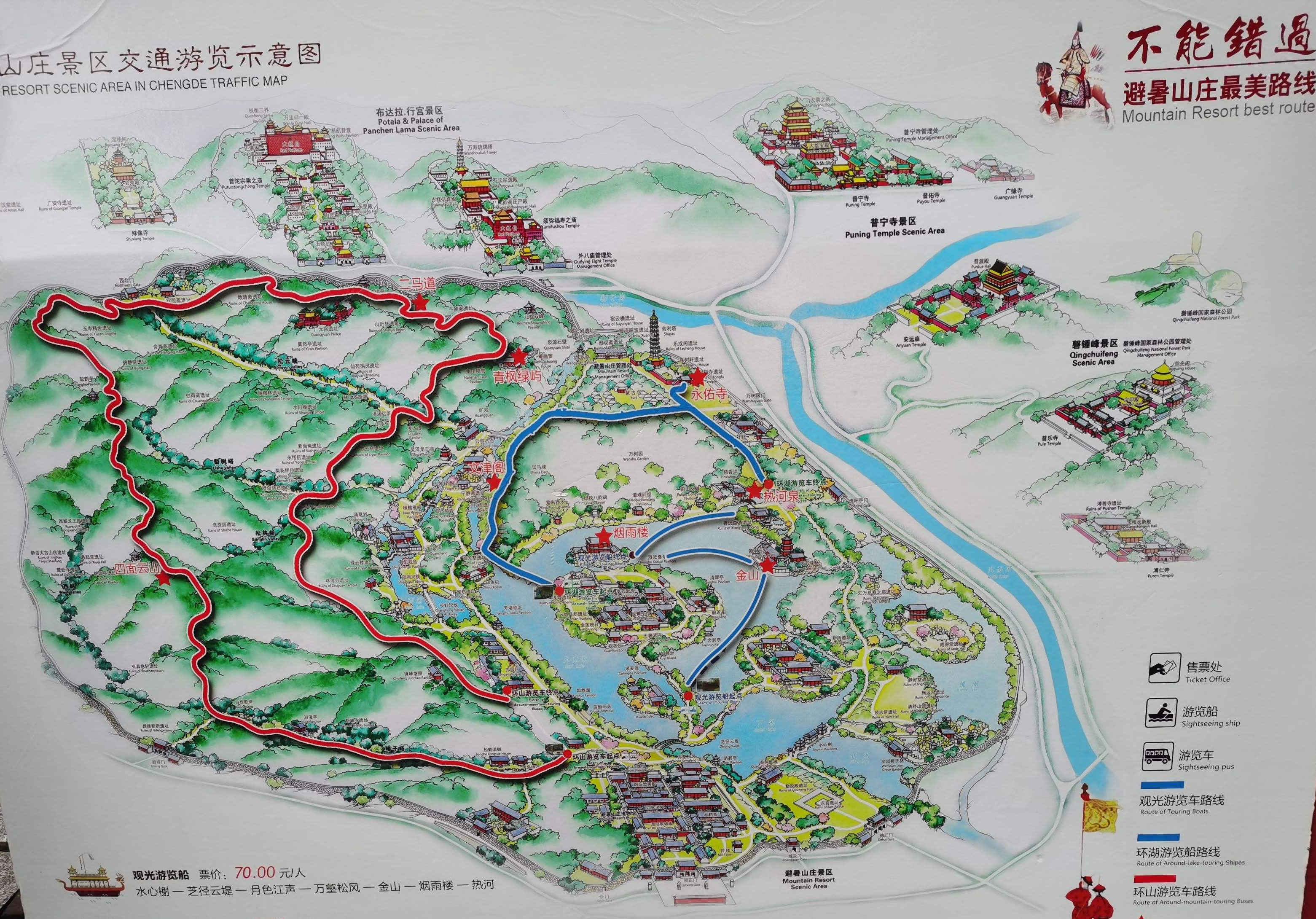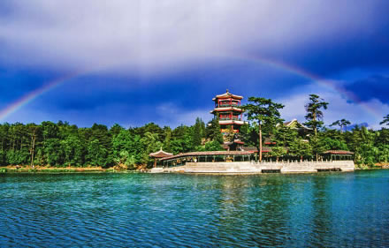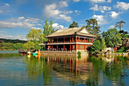 湖泊區(qū):苑景區(qū)的精華基本上在湖泊區(qū),康熙曾夸耀說(shuō),“天然風(fēng)景勝西湖”。由于洲島錯(cuò)落,湖面被長(zhǎng)堤和洲島分割成5個(gè)湖,各湖之間又有橋相通,兩岸綠樹成蔭,山莊主要的風(fēng)景建筑又都散落在湖區(qū)的周圍,因此顯得曲折有致,秀麗多姿。湖泊區(qū)位于山莊東南,面積49.6萬(wàn)平方米。有大小湖泊八處,即西湖、澄湖、如意泅、上湖、下湖、銀湖、鏡湖及半月湖,統(tǒng)稱為塞湖。 湖區(qū)的風(fēng)景建筑大多是仿照江南的名勝建造的,如“煙雨樓”,是模仿浙江嘉興南湖煙雨樓的形狀修的。金山島的布局仿自江蘇鎮(zhèn)江金山。湖中的兩個(gè)島分別有兩組建筑,一組叫“如意洲”,一組叫“月色江聲”!叭缫庵蕖鄙嫌屑偕、涼亭、殿堂、廟宇、水池等建筑,布局巧妙,是風(fēng)景區(qū)的中心!霸律暋笔怯梢蛔碌乃暮显汉蛶鬃、堂組成。每當(dāng)月上東山的夜晚,蛟潔的月光,映照著平靜的湖水,山莊內(nèi)萬(wàn)籟俱寂,只有湖水在輕拍堤岸,發(fā)出悅耳的聲音,“月色江聲”的題名便是由此而來(lái)。湖泊區(qū)集南方園林之秀和北方園林之雄,將江南園林的景觀移植到塞外。區(qū)內(nèi)湖泊總稱“塞湖”,總面積57公頃。