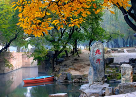 熱河泉位于山莊湖區(qū)東北隅,是山莊湖泊的主要水源。清澈的泉水從地下涌出,流經(jīng)澄湖、如意泅、上湖、下湖,自銀湖南部的五孔閘流出,沿長(zhǎng)堤匯入武烈河。熱河全長(zhǎng)700多米,在一般地圖上找不到它有蹤跡。它是中國(guó)最短的河流。熱河發(fā)源于避暑山莊諸泉的一條涓涓細(xì)流,主要水源來(lái)自熱河泉。冬季水溫為8℃。泉側(cè)有巨石,刻“熱河”兩字。
