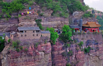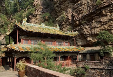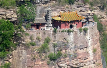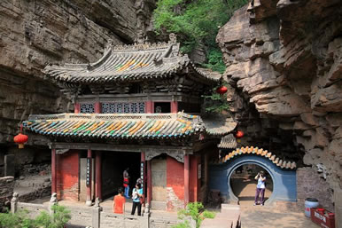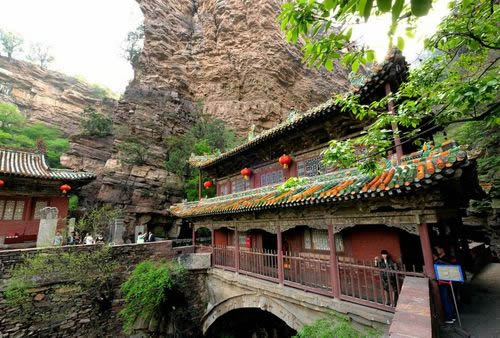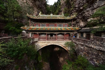 一絕“橋樓殿”。橋凌駕于百仞峭壁之間,仰視藍(lán)天一線,俯首萬丈深淵。形制如同趙州橋敞肩拱式。橋上建樓,云飛樓動(dòng),樓內(nèi)建殿,殿內(nèi)三尊大佛。真是“千丈虹橋望入微,天光云彩共樓飛”,不是仙境勝似仙境,疑是天堂落塵!,F(xiàn)為中國三大懸空寺之一。