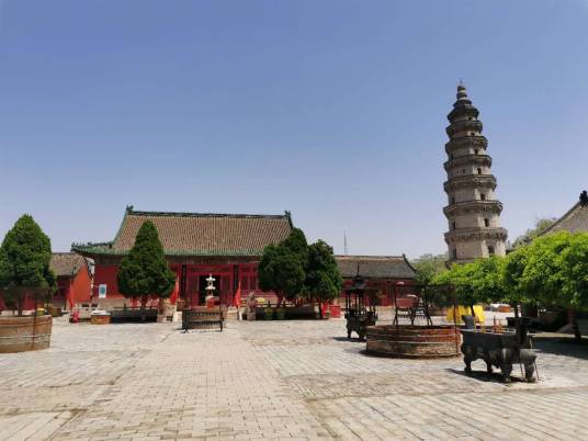 寶云寺內(nèi)有一塔,高36.5米,塔體為八面棱錐體磚木結(jié)構(gòu),自四層以上四面有門(mén),塔的各層建筑風(fēng)格各異,或成鴛鴦斗拱,或成梅花斗拱,雄渾古樸,氣勢(shì)磅礴。若登塔頂,需有一定的勇氣,因?yàn)槊康且粚佣家@塔沿半圈,找到另一側(cè)的入口。寶云塔原名擎天塔,位于衡水市區(qū)西南的舊城村東。該塔原在寶云寺內(nèi),因此稱寶云塔。