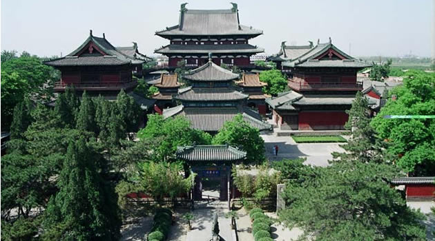 隆興寺:位于石家莊市正定縣縣城,是國內(nèi)現(xiàn)存時代較早、規(guī)模較大而又保存完整的佛教寺院之一。隆興寺始建于隋開皇六年(586年),原名“龍藏寺”。宋初,太祖祖趙匡胤敕令在龍藏寺內(nèi)鑄造銅佛,并蓋大悲閣,遂大興土,以大悲閣為主體的一組宋代建筑先后告成。到了清康熙、乾隆年間,又兩次大規(guī)模維修和增建,寺院發(fā)展到鼎盛時期。清康熙四十八年(1709),改龍藏寺為隆興寺,俗稱大佛寺。 隆興寺這座千年古剎,歷代帝王曾多次到此巡境幸駐蹕,上香禮佛,題詩書匾,刻碑立石?梢姰(dāng)年這里晨鐘暮鼓,鐘磬齊鳴,香煙繚繞,“南無”聲聲的歷史盛況。大悲閣是隆興寺的主體建筑,五檐三層,高33米。閣內(nèi)正矗立著高大銅佛鑄像,這就是名聞遐邇的正定大菩薩。這尊千手千眼觀音菩薩像有22.28米高,有42臂分別執(zhí)日、月、凈瓶、寶杖、寶鏡、金剛杵等法器。面部情端祥恬靜,仁慈莊重。達到了瞻之彌高、仰之益恭的藝術(shù)效果。