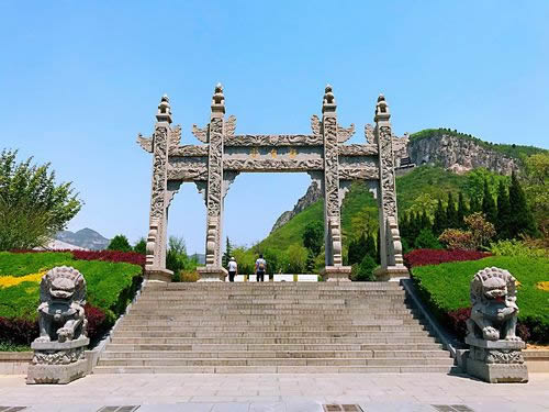 媧皇宮山門(mén),坐東朝西,有三孔磚砌拱門(mén)組成。兩邊兒對(duì)聯(lián)寫(xiě)著:鳳山名隆仙島;神仙勢(shì)壓十洲。橫批是:蓬壺仙境。進(jìn)了門(mén)是木牌坊,上額書(shū)寫(xiě)“媧皇古跡”。牌坊西是皮瘍廟,塑著皮瘍王和魯班的神像。牌坊東樹(shù)一通古牌,上寫(xiě)《古中皇山》。走過(guò)牌坊,東面峭壁上有北齊時(shí)的磨崖刻經(jīng)。再往前走是石券門(mén),頂上建鼓樓。券額上刻著“中州勝景”四個(gè)大字 。