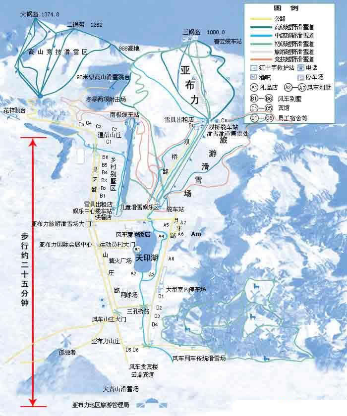 亞布力滑雪旅游度假區(qū)由具有國(guó)際標(biāo)準(zhǔn)的高山競(jìng)技滑雪區(qū)和旅游滑雪區(qū)兩大部分組成,占地面積22.55平方公里。在大鍋盔(海拔1374米)、二鍋盔(海拔1262米)和二鍋盔與三鍋盔之間的海拔988米高地處修建了具有國(guó)際標(biāo)準(zhǔn)的高山競(jìng)技滑雪場(chǎng),有9條高山滑雪道,7條越野滑雪道,6條滑雪纜車和花樣跳臺(tái),90米級(jí)高山跳臺(tái),冬季兩項(xiàng)靶場(chǎng)及室內(nèi)體育館、運(yùn)動(dòng)員村等場(chǎng)地。在三鍋盔(海拔1000.8米)建成了大型旅游滑雪場(chǎng),擁有l(wèi)l條高、中、初級(jí)滑雪道,總長(zhǎng)度30公里,其中有長(zhǎng)5公里的5號(hào)雪道,l條5公里長(zhǎng)的環(huán)形越野滑道,2公里長(zhǎng)的全墊升氣墊船、雪地草地摩托及雪橇專用道,3條雙人吊椅式旅游纜車索道和3條拖牽式旅游索道。