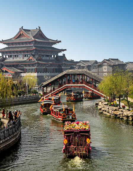 清明上河園位于開(kāi)封古城內(nèi)西北隅,是以宋代張擇端的名《清明上河圖》為藍(lán)本,集中再現(xiàn)原圖風(fēng)物景觀的大型宋代民俗風(fēng)情游樂(lè)園,是國(guó)家AAAAA級(jí)景區(qū)。占地面積510畝,主要建筑有城門樓、虹橋、街景、店鋪、河道、碼頭、船坊等。園區(qū)按《清明上河圖》的原始布局,集中展現(xiàn)宋代諸如酒樓、茶肆、當(dāng)鋪、汴繡、官瓷、年畫等現(xiàn)場(chǎng)制作;薈集民間游藝、雜耍、盤鼓表演;神課算命、博彩、斗雞、斗狗等京都風(fēng)情,并根據(jù)宋氏歷史故事表演“文包武楊”及宋代婚禮習(xí)俗等節(jié)目。