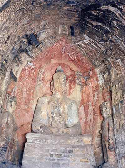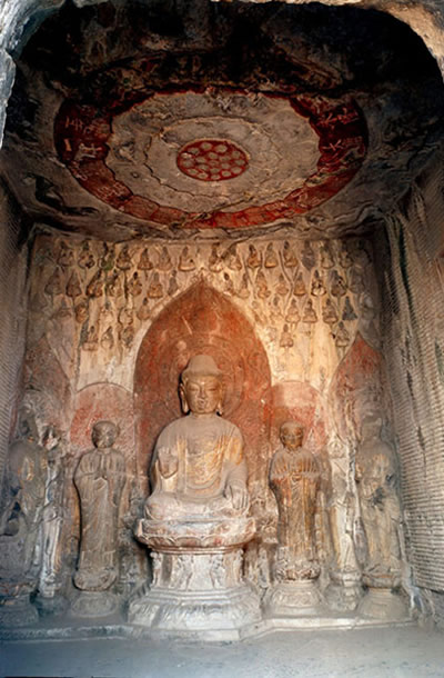 賓陽中洞是北魏時期(公元386~512年)的代表性作品。這個洞窟前后用了24年才建成,是開鑿時間最長的一個洞窟。洞內(nèi)有11尊大佛像。主像釋迦牟尼像,面部清秀,神情自然,堪稱北魏中期石雕藝術(shù)的杰作。主像座前刻有兩只姿態(tài)雄健的石獅。左右侍立二弟子,二菩薩,菩薩像含笑凝眸,溫柔敦厚。洞中還雕刻著眾菩薩,弟子聽法的浮雕像,栩栩如生。窟頂飛天仙子的刻畫也十分傳神。