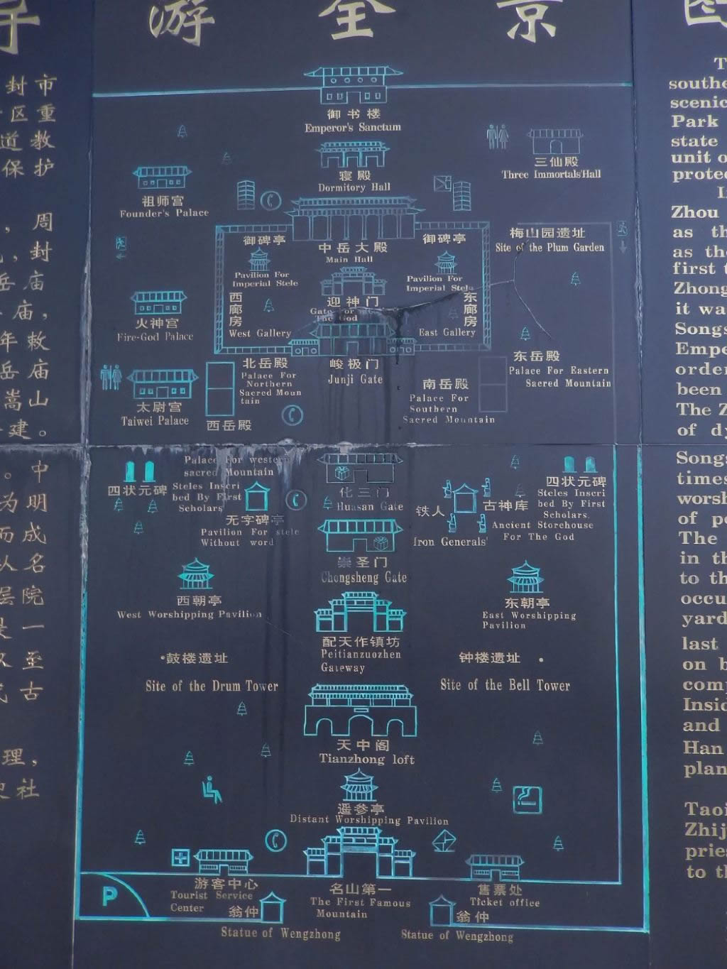 中岳廟沿中軸線依次有中華門,遙參亭、天中閣、崇圣門、化三門、崇高峻極坊、峻極殿、寢殿、御書樓等建筑,共11進院落。