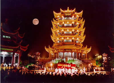 號(hào)稱江南三大名樓之一的黃鶴樓,原址在湖北武昌蛇山黃鶴磯頭,原為辛氏開設(shè)的酒店,一道士為了感謝她千杯之恩,臨行前在壁上畫了一只鶴,告之它能下來起舞助興。從此賓客盈門,生意興隆。過了十年,道士復(fù)來,取笛