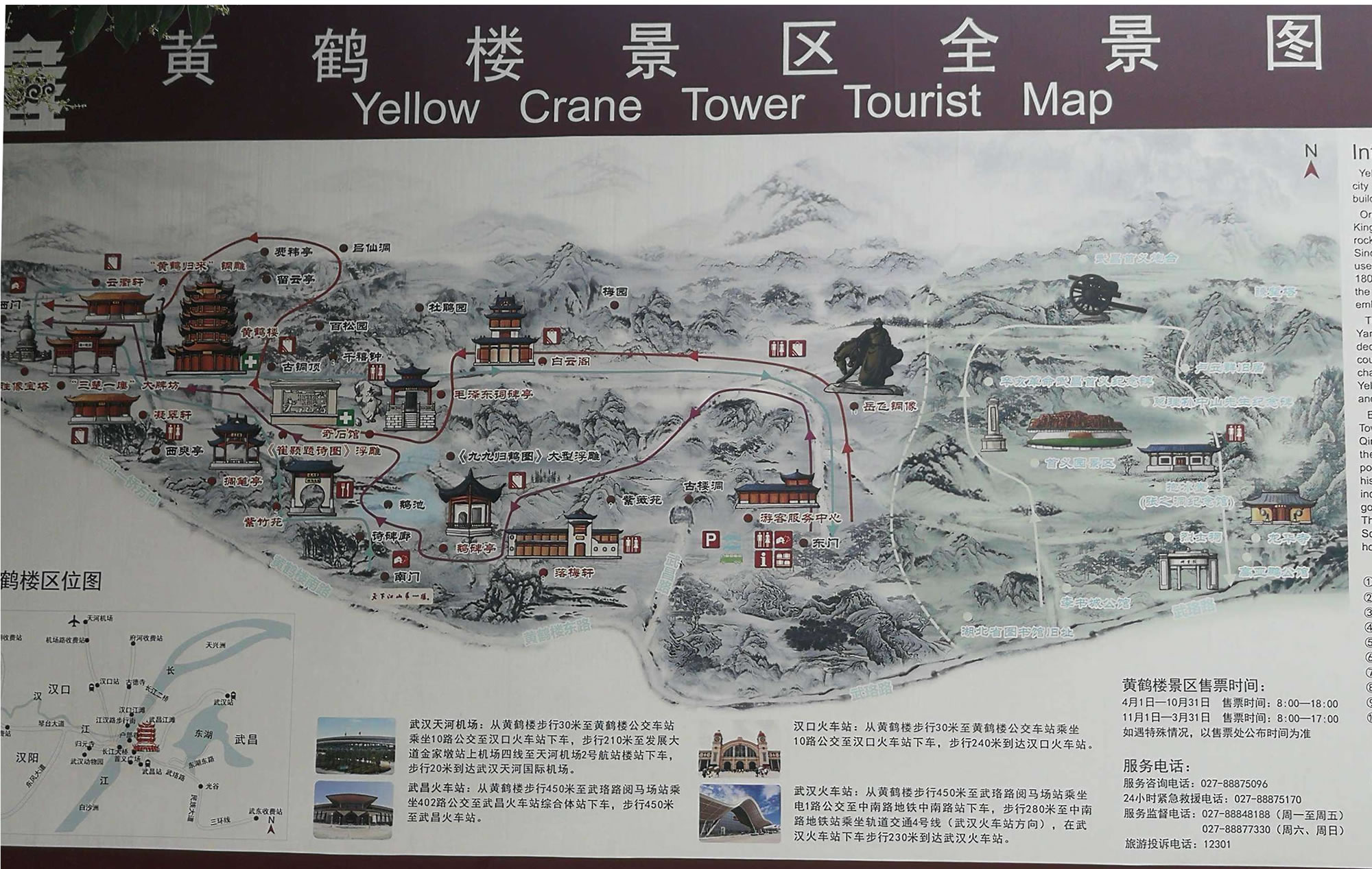 塔、碑廊、山門等建筑。整個(gè)建筑具有獨(dú)特的民族風(fēng)格。黃鶴樓內(nèi)部,層層風(fēng)格不相同。底層為一高大寬敞的大廳,其正中藻井高達(dá)10多米,正面壁上為一幅巨大的“白云黃鶴”陶瓷壁畫,兩旁立柱上懸掛著長達(dá)7米的楹聯(lián):爽氣西來,云霧掃開天地撼;大江東去,波濤洗凈古今愁。二樓大廳正面墻上,有用大理石鐫刻的唐代閻伯瑾撰寫的《黃鶴樓記》,它記述了黃鶴樓興廢沿革和名人軼事;樓記兩側(cè)為兩幅壁畫,一幅是“孫權(quán)筑城”,形象地說明黃鶴樓和武昌城相繼誕生的歷史;另一幅是“周瑜設(shè)宴”,反映三國名人去黃鶴樓的活動(dòng)。三樓大廳的壁畫為唐宋名人的“繡像畫”,如崔顥、李白、白居易等,也摘錄了他們吟詠黃鶴樓的名句。四樓大廳用屏風(fēng)分割幾個(gè)小廳,內(nèi)置當(dāng)代名人字畫,供游客欣賞、選購。頂層大廳有《長江萬里圖》等長卷、壁畫!