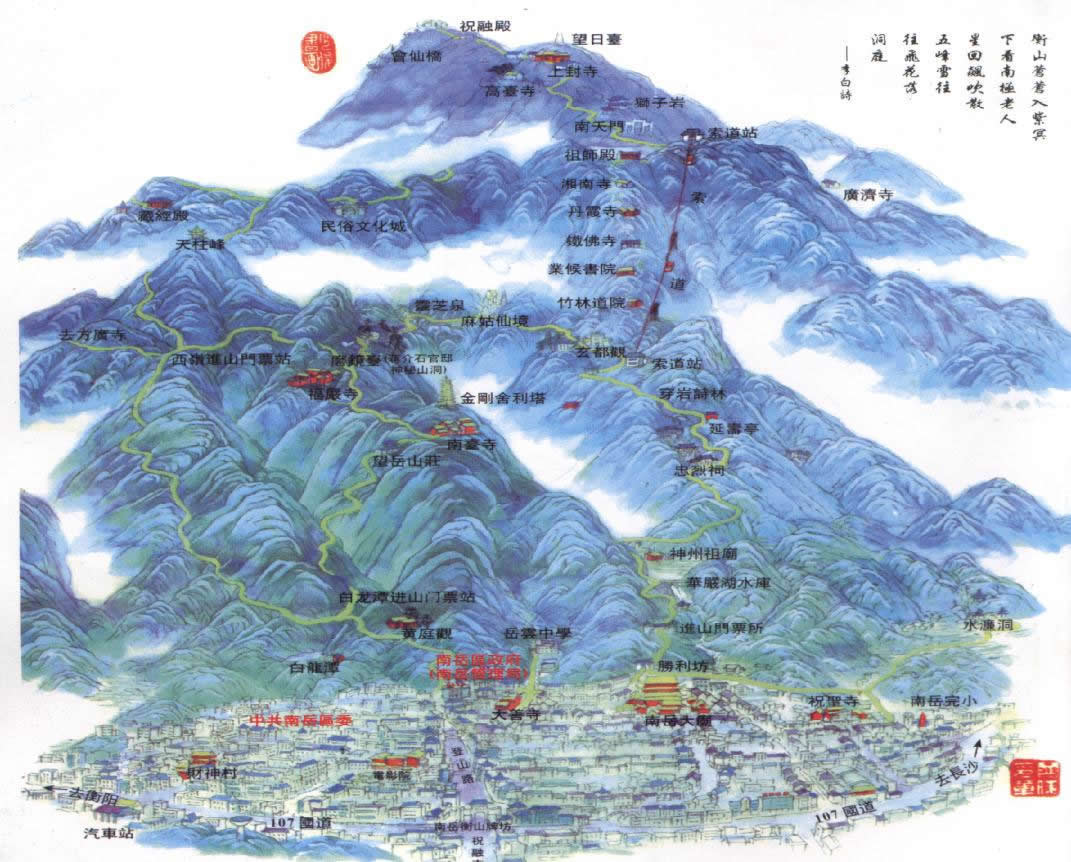 衡陽(yáng)市南岳衡山旅游區(qū)南距衡陽(yáng)市中心35千米,屬南岳區(qū)管轄,總面積184平方千米,為國(guó)務(wù)院1982年第一批公布的國(guó)家重點(diǎn)風(fēng)景名勝區(qū)。有9溪、10橋、24泉、15洞、9池、9潭、38巖等。“祝融峰之高,藏經(jīng)殿之秀,方廣寺之深,水簾洞之奇”,古稱南岳“四絕”,“麻姑仙境之幽,穿巖詩(shī)林之趣,龍鳳飛瀑之雄,禹王古城之古”,是南岳“新四景”。南岳旅游風(fēng)景名勝區(qū)居湘中偏東地區(qū),以主峰祝融為中心,總面積184平方千米。大致分南岳古鎮(zhèn)、水簾洞、忠烈祠、磨鏡臺(tái)、祝融峰、藏經(jīng)殿、方廣寺、龍鳳潭8個(gè)游覽區(qū)和西嶺1處避暑區(qū)。