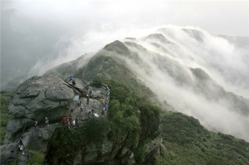 祝融峰是衡山的最高峰,是中國(guó)紀(jì)念人文祖先祝融氏的山峰!白H诜逯摺睘槟显里L(fēng)光“四絕”之首。由于常年煙云的烘托和群峰的疊襯,加之它矗立于地勢(shì)相對(duì)低洼的湘南盆地之中,更顯得它峻極天穹。在古語中“!笔浅志糜肋h(yuǎn)之意,“融”是光明之意,“祝融”是永遠(yuǎn)光明。唐代大文豪韓愈在《游祝融峰》詩(shī)中贊嘆道“萬丈祝融拔地起,欲見不見輕煙里”。北宋黃庭堅(jiān)寫道:“萬丈祝融插紫霄,路當(dāng)窮處架仙橋。上觀碧落星辰近,下視紅塵世界遙!贝颂帪閿埲悍,看日出,觀云海,賞雪景的最佳去處。