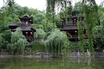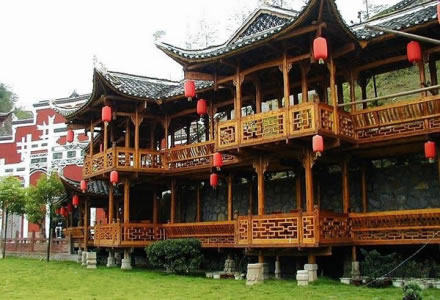其主要由土家建筑群落、民風民俗展示、文藝表演、客房、餐飲、大型狩獵場、珍稀植物園、根雕基地等功能區(qū)構成。園內建筑多為木石結構,雕梁畫棟,金碧輝煌、飛檐翹角、玲瓏雅致。代表作有土司城堡、擺手堂、土家山寨、垕王宮等。特別是沖天樓,依山造閣,氣勢恢宏,樓高48米,九重十二層,曲徑回復,獨具匠心。
