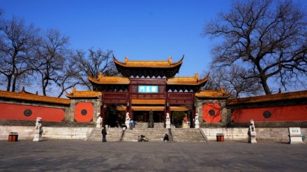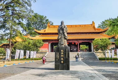 宮墻兩端各有磚坊一座,三間三拱門(mén),中門(mén)較高大,上面有磚刻橫額,東為“德配天地”,西為“道貫古今”。這八個(gè)大字都是曾國(guó)藩所書(shū)。