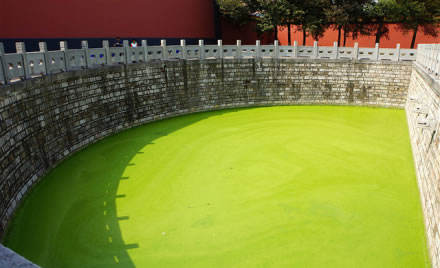 泮池位于萬(wàn)仞宮墻北側(cè),水池為半圓形,周?chē)惺瘷跅U,稱為“泮池”,是文廟標(biāo)志性建筑之一。泮池下部原有兩組涵洞與宮墻外的運(yùn)瀆相通,池水終年不竭?箲(zhàn)期間泮池曾被填平,1970年重新開(kāi)挖,現(xiàn)與運(yùn)瀆已不再相通。