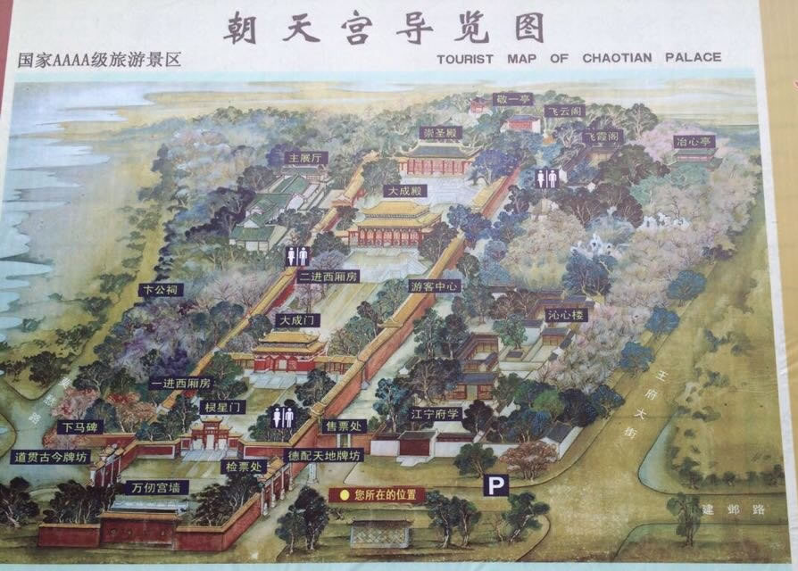 清朝道光年間因朝天宮屢遭火災(zāi),當(dāng)時(shí)風(fēng)水家把朝天宮大山門(mén)由朝正東,改為偏向東南。
