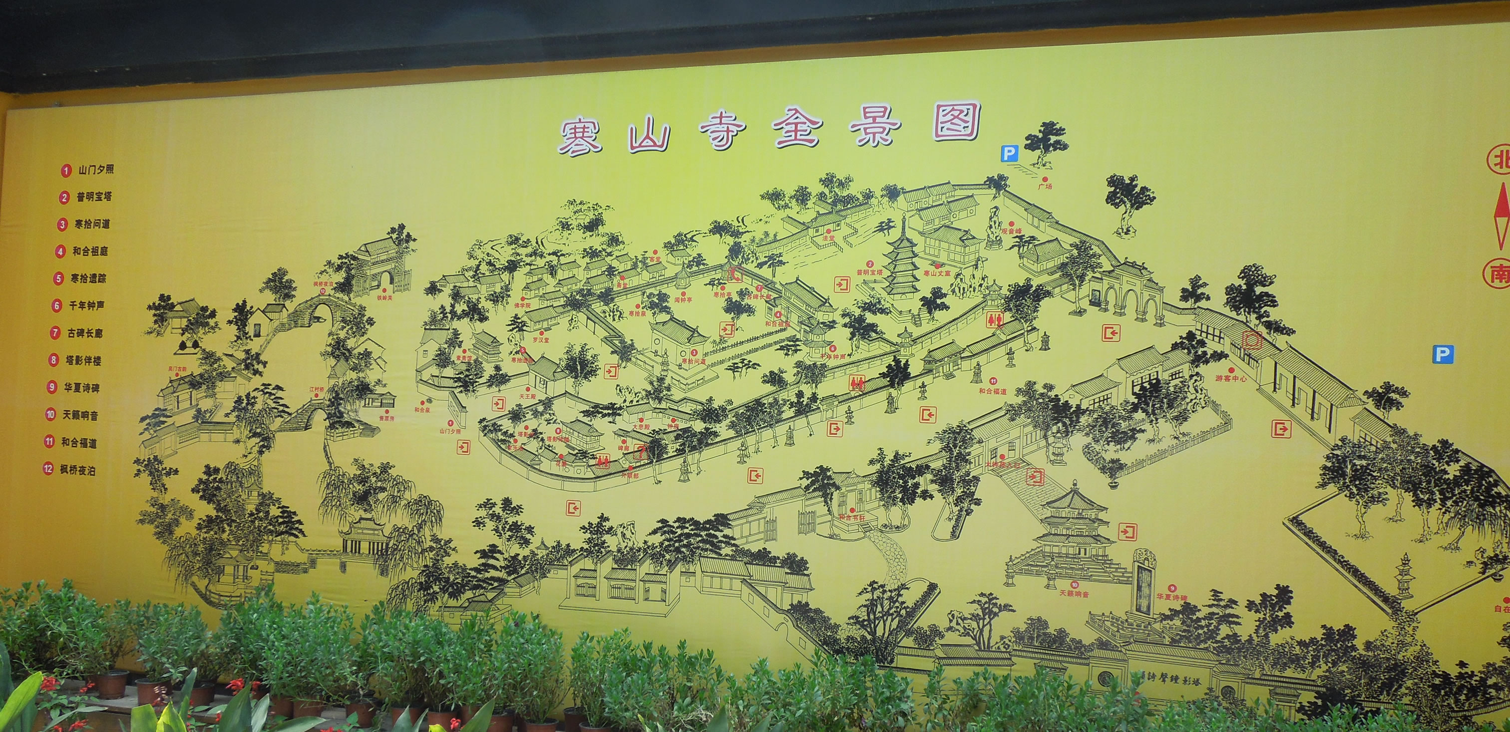 寒山寺的主庭園左側(cè)的花壇兩面嵌長(zhǎng)條石刻兩塊,一為明代崇幀年間刻的"寒拾遺蹤";另一刻清末江蘇巡撫程德全寫(xiě)的"妙利宗風(fēng)"。出大雄寶殿,左通普明寶塔和方丈室,右達(dá)名聞遐邇的聽(tīng)"夜半鐘聲"的鐘樓,正前方的兩層屋宇是藏經(jīng)樓。遠(yuǎn)望屋頂,可見(jiàn)唐僧、孫悟空等西天取經(jīng)塑像群。藏經(jīng)樓樓上秘藏珍貴佛經(jīng),樓下叫"寒拾殿",寒拾殿后墻的背面立一巨碑,刻著千手千眼觀音、韋馱和關(guān)公等人物。鐘樓就在寒拾殿旁。