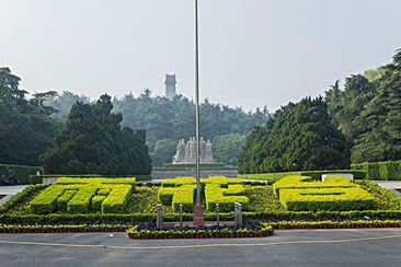 兩側(cè)的環(huán)陵大道可直達(dá)雨花臺主峰,主峰上矗立著一塊42.3米高的石碑,碑身正面鐫刻著鄧小平親筆題寫的"革命烈士紀(jì)念碑"七個金字,背面刻著紀(jì)念碑文。碑前還豎有一座高5.5米的烈士青銅塑像。在紀(jì)念碑南邊的山崗上還有一座呈"U "字型,頗具民族風(fēng)格的花崗巖結(jié)構(gòu)的大型建筑--"革命烈士紀(jì)念館"。館長94米、寬49米,主堡高26米,建筑面積5900平方米,館內(nèi)陳列著烈士們的遺像、遺書和遺物等。