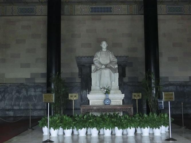 祭堂中央供奉孫中山坐像,高4.6米,是世界名雕刻家保羅朗特斯基在法國(guó)巴黎用意大利白色大理石雕像,底座鐫刻六幅浮雕,是孫中山從事革命活動(dòng)的寫照。孫中山先生身著長(zhǎng)袍馬褂,高額廣頤,手持一本長(zhǎng)卷,那凝視著前方的深邃目光,那凝重的身軀,給肅立于此的人們以難忘的啟迪。