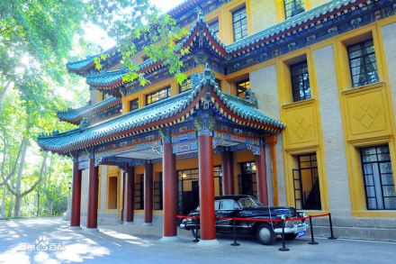 美齡宮是蔣介石及其夫人宋美齡下榻的別墅,正式名稱為“國(guó)民政府主席官邸”,有“遠(yuǎn)東第一別墅”的美譽(yù)。美齡宮主體建筑是一座三層重檐山式宮殿式建筑,頂覆綠色琉璃瓦。在其房檐的琉璃瓦上雕著1000多只鳳凰,是中國(guó)唯一一例。整座建筑富麗堂皇,內(nèi)部裝飾奢侈豪華,裝飾以旋子彩繪,特別是藍(lán)底云雀瓊花圖案出自工筆畫家陳之佛之手,獨(dú)一無二。四周林木藏盛,終年百花飄香。汽車可直抵宮門,樓底層為接待室、秘書辦公室等,二樓西邊是會(huì)客室、起居室,東邊是蔣介石、宋美齡夫婦臥室。