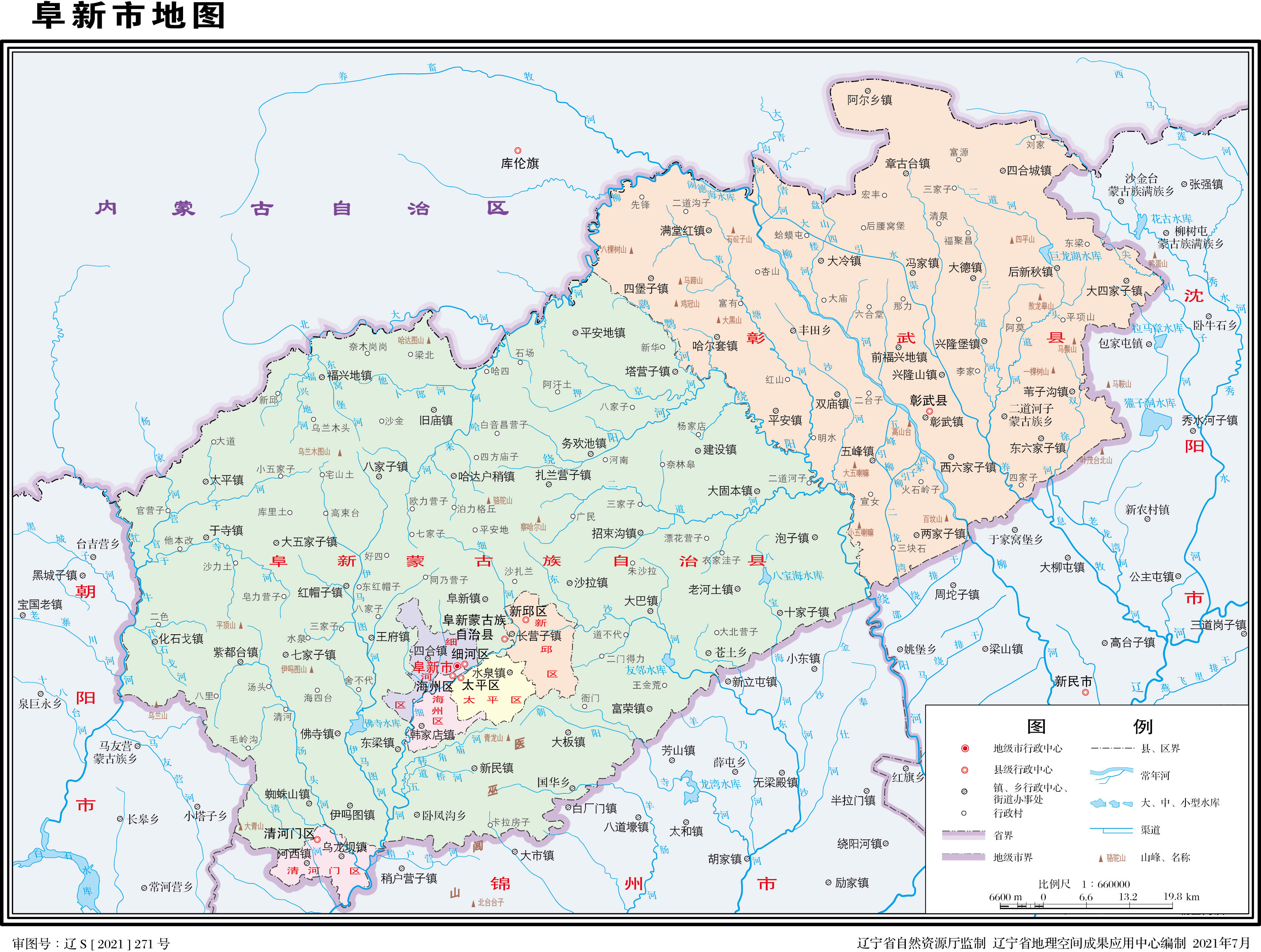 民國初年,仍延續(xù)清末建置。民國二十二年(1933年),日本侵略者侵占阜新后,日偽當(dāng)局于民國二十九年(1940年)1月1日,由阜新縣境劃出新邱、長營子、米家窯、海州、孫家灣和今阜新鎮(zhèn)等地置阜新市。同時,實行廢縣存旗體制,撤銷阜新縣。