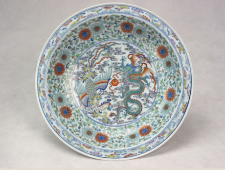 清雍正款斗彩龍鳳大盤:此盤為白地斗彩大盤,盤內(nèi)飾斗彩龍鳳戲珠紋,一條行云五爪飛龍,龍身蜿蜒矯健,鳳舞展翅穿于祥云之間,呈龍飛鳳舞圖案。盤外飾海水江崖,壽山福海。壽山上靈芝盛開(kāi),云蝠翩翩。底“大清雍正年制”六字兩行雙圈青花楷書(shū)書(shū)款。整個(gè)大盤胎質(zhì)細(xì)膩,釉色純正,造型規(guī)矩,為清宮祝壽時(shí)的御用器皿。