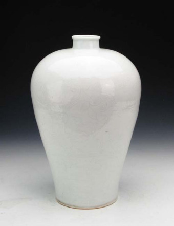 明永樂(lè)白釉暗串枝蓮花梅瓶:小口,圓唇,短頸,豐肩。器物紋飾為劃花,器物肩部上下各兩道弦紋,中間為靈芝纏枝花紋,八顆靈芝首尾相接,纏枝不斷。腹部?jī)山M大荷葉蓮花,每組為三朵蓮花并蒂爭(zhēng)相開(kāi)放,神態(tài)各異。此瓶為明永樂(lè)時(shí)期景德鎮(zhèn)官窯器,甜白釉,白中閃青。釉色白瑩,光亮潤(rùn)澤,胎質(zhì)細(xì)潔,整個(gè)器物造型規(guī)矩。肩部圓潤(rùn)略顯豐滿。底足為平底。