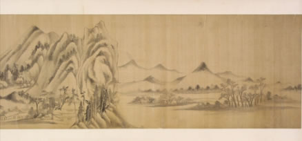 董其昌仿米黃山水圖卷:明晚期,絹本。用筆參以披麻與米點(diǎn)皴法,為其自家面貌。卷后部行書(shū)自題:“家有黃子久《富春大嶺圖》、米元暉《瀟湘圖》,和會(huì)兩家筆意為此卷,大都子久畫出于巨然與海岳父子同參也!焙笫鹂睿骸岸鬃R(shí)”,下鈐“知制誥日講官”、“董其昌印”白文印二方。款側(cè)鈐“楨父審定”、“墨緣堂來(lái)氏收藏書(shū)畫記”二印。