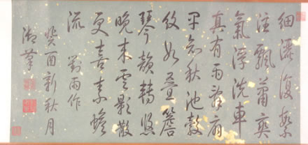 清弘歷行書(shū)對(duì)雨詩(shī)卷:此書(shū)卷作于乾隆十八年(1753)。綠色片金蠟箋紙。引首騎縫鈐篆書(shū)朱文“石渠寶笈所藏”方印,行書(shū)寫自作五言律詩(shī)一首,全詩(shī)為“細(xì)灑復(fù)絮注,飄蒲爽氣浮。洗車真有雨,壽扇果知秋。池轂紋如疊,檐琴韻轉(zhuǎn)悠。晚來(lái)云影散,更喜素蟾流!痹(shī)后自題“對(duì)雨作”,后署款“癸酉新秋月,御筆”。