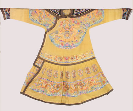 清明黃納紗五彩金龍夏朝服:清代光緒皇帝載湉御用。此朝服是夏季禮服之一,為其登基、大婚、萬(wàn)壽圣節(jié)、祭天等重大典禮和祭祀活動(dòng)時(shí)所穿禮服。為明黃顏色,是一種披肩領(lǐng)、馬蹄袖的大襟袍。披肩為黑紗地納紗繡平金龍二條,上衣兩肩和前胸、后背飾正龍各一條,飾有傳統(tǒng)紋樣十二章,間以五色云紋,下幅為平水紋飾。