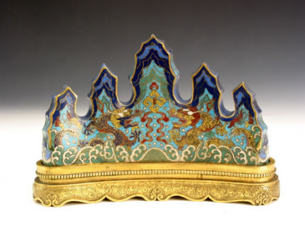 乾隆款掐絲琺瑯海水雙龍筆架:筆架整體呈弧形山巒狀,五組山峰聳立,峰與峰之間壑谷可做承筆之用。山體采用掐絲琺瑯工藝制成,以深藍(lán)、淺藍(lán)、綠色、純藍(lán)等色為地,使山峰更具層次感;峰下飾有金黃色行龍,龍首之間為金黃色萬(wàn)字紋,龍身下方飾有綠色海水紋。筆架之下為弧形鎏金底座,鏨刻一圈珍珠紋,其下為束腰式,再下面鏨刻卷草紋,座底為如意云紋足,底部中央鏨刻陰文楷書(shū)“乾隆年制”4字款。