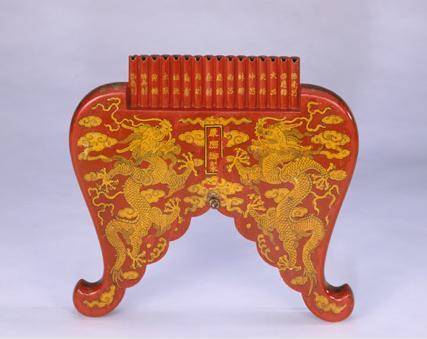清乾隆款朱漆描金云龍紋排簫:通體遍涂朱紅彩漆,大部分為木制,刻成獸腿開(kāi)叉形狀,腿下部雕成云頭形狀。雙面均描金繪二龍戲珠、浮云、火焰圖案,在正面火焰珠位置為長(zhǎng)條方池,內(nèi)有金漆楷書(shū)“乾隆八年制”年款。排簫上部為單排十六根竹管,用于吹奏之用,管上正面各以金漆書(shū)寫楷書(shū)律名,從左至右依序?yàn)椤氨兑膭t”“倍無(wú)射”“黃鐘”“太簇”“姑洗”“蕤賓”“夷則”“無(wú)射”“應(yīng)鐘”“南呂”“林鐘”“仲呂”“夾鐘”“大呂”“倍應(yīng)鐘”“倍南呂”。排簫底部系有一條五彩流蘇。