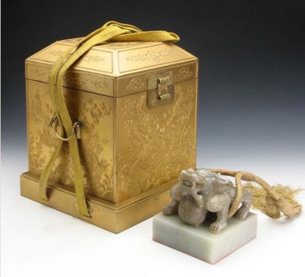 清世宗憲皇帝謚寶:此寶為嘉慶四年(1799)清宮內(nèi)府遵旨由舊寶改鐫而成。寶上部為單體蹲龍紐,描金,紐上系明黃絲繩。謚寶文字為滿、漢文合璧,均為朱文,右側(cè)為漢文篆書(shū)四行,左側(cè)為滿文篆書(shū)四行。其文為“世宗敬天昌運(yùn)建中表正文武英明寬仁信毅睿圣大孝至誠(chéng)憲皇帝之寶”。謚寶外包明黃織金四則團(tuán)花暗云紋錦包袱皮,用雙層龍鳳紋金漆套盒盛裝。該寶于嘉慶四年改鐫后由北京送至盛京太廟尊藏,清末民國(guó)時(shí)期存于沈陽(yáng)故宮崇謨閣內(nèi)。