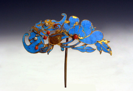 清點(diǎn)翠頭簪:用珊瑚、珍珠制成。整個(gè)主題為蝶戀花,蝴蝶在花下,一花開(kāi)放,旁有兩朵含苞欲放的花,蝴蝶和花均為藍(lán)色,應(yīng)為翠鳥(niǎo)毛制成,花瓣為兩層,均為五瓣,花蕊用珊瑚制成,兩花苞微微下耷,蝴蝶的翅膀?yàn)檎归_(kāi)狀,蝴蝶的眼睛及翅膀上均有珊瑚珠。