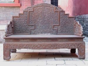 崇政殿室內(nèi)的寶座、屏風(fēng)等陳設(shè),并非清太宗時(shí)期的原貌,而是乾隆十二年(1747年)根據(jù)皇帝的旨意重新設(shè)計(jì)制做的,堂陛之內(nèi)的屏風(fēng)寶座,是乾隆特命仿北京故宮乾清宮所用加以縮小精心制作的,寶座、屏風(fēng)各以九條龍做為主要裝飾,全部罩以金漆,體現(xiàn)其唯一的使用者──皇帝的無(wú)上尊嚴(yán)。屏風(fēng)上的四言十二句銘文,與乾清宮屏風(fēng)上的完全相同 ,是康熙皇帝從古代經(jīng)書(shū)中摘出,做為自己和后世皇帝治理國(guó)家的座右銘鐫刻在御座之旁的。陳設(shè)在龍椅前后的鶴式燭臺(tái)、熏爐、塔式香亭、 端、“太平有象”等,都是乾隆年間宮中精制的琺瑯禮器,專用于皇帝御座周圍,既為熏香之用,也有驅(qū)邪諏吉的寓意,使得“真龍?zhí)熳印迸R朝理政之處更具有莊嚴(yán)神圣的氣氛。乾隆、嘉慶、道光幾位皇帝東巡盛京期間,都曾坐在這里接受群臣的朝賀叩拜,慶祝自己祭陵大典的成功。