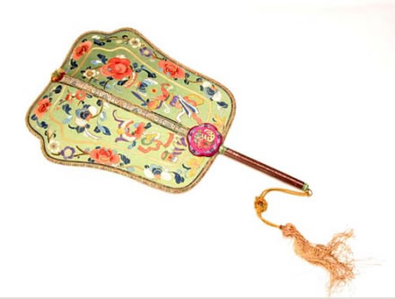 清紅木柄綠緞彩繡博古紋扇:此扇為多弧邊長(zhǎng)方形,扇頂微向后彎曲,扇面為綠色緞制,滿繡五彩花卉、博古紋飾,另有金錢壓紋邊,扇中骨及邊緣均用彩繡錦邊制成。扇面與柄桿交接處有紅緞五瓣梅花形裝飾,花內(nèi)繡有佛手、瓜、桃及五蝶圖案。扇柄為紅木制成,刻有花卉紋,柄兩頭鑲有綠色骨飾。柄頭系黃色絲穗。
