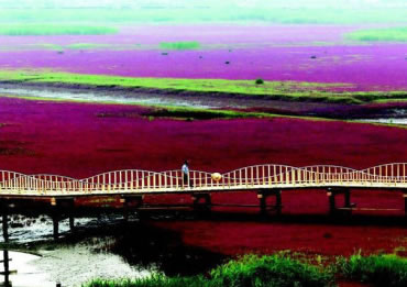 這里是遼河口和渤海的交界處,兩河水不斷地沖刷翅堿蓬,翅堿蓬會越來越紅。初一、十五大潮時海水蓋過翅堿蓬,成為一片大海的奇觀,潮落后,鮮艷的翅堿蓬依然矗立在泥潭中。