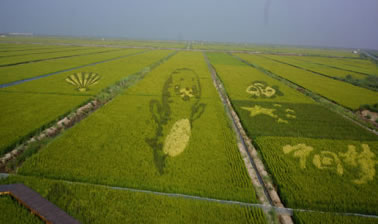 稻田作畫,又稱稻田彩繪,主要是以黃色、綠色和紫色葉水稻種植于水田中,栽種時先在農(nóng)田里用傳統(tǒng)畫線器,畫出九宮格,依圖樣定出坐標,再牽線繪出圖樣或字體輪廓,最后種上黃色秧苗,隨著水稻生長,就會呈現(xiàn)出預先規(guī)劃的圖形或文字。在不同的位置栽種不同的稻米品種,通過精細巧妙的排列組合,不同顏色葉子的稻米會在生長過程中自然鋪陳出一幅幅美麗的圖畫。稻田彩繪可以維持兩個半月左右。