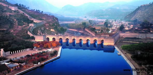 九門口長城:坐落在遼寧省綏中縣李家鄉(xiāng)新臺子村境內(nèi),距山海關15公里,全長1704米。其南端起于危峰絕壁間,與自山海關方向而來的長城相接。自此,長城沿山脊向北一直延伸到當?shù)氐木沤幽习叮趯掃_百米的九江河上,筑起規(guī)模巨大的過河城橋,以此繼續(xù)向北逶迤于群山之間。“城在水上走,水在城中流。”便是人們對九門口長城的形象描述。