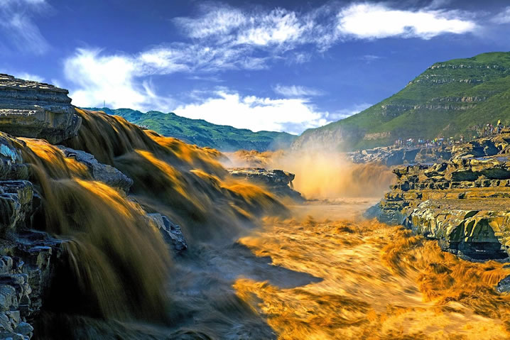 - 壺口瀑布:黃河奔流至此,兩岸石壁峭立,河口收束狹如壺口,故名壺口瀑布。瀑布上游黃河水面寬300米,在不到500米長(zhǎng)距離內(nèi),被壓縮到20—30米的寬度,1000立方米/秒的河水,從20多米高的陡崖上傾注而瀉,形成“千里黃河一壺收”的氣概。