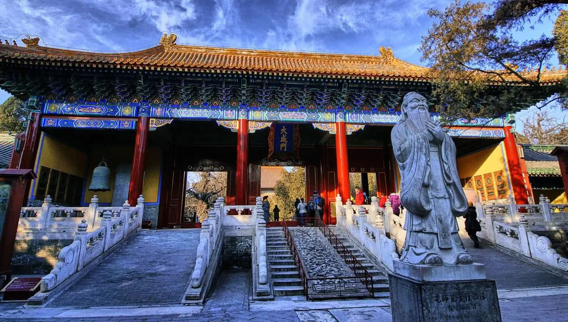 北京孔廟,又名“先師廟”,位于北京東城區(qū),為中國古代元、明、清三朝祭祀孔子的場所。始建于元大德六年(1302年)六月,大德十年(1306年)建成,面積2.2萬平方米,明永樂九年(1411年)重建。北京孔廟坐北朝南,古建筑面積約有7400平方米。主體建筑為沿中軸線分布,左右對稱的中國傳統(tǒng)建筑布局,三進院落,中軸線上的建筑從南向北依次為先師門、大成門、大成殿、崇圣門及崇圣祠,主體建筑都覆以黃色琉璃瓦。清光緒三十二年(1906年),北京孔廟大規(guī)模修繕,民國五年(1916年)竣工。至此孔廟形成現(xiàn)有的規(guī)模和布局。北京孔廟進士題名碑為研究中國古代科舉制度的重要文獻資料。孔廟歷經(jīng)700多年的歷史文化積淀,遺留下來的文物,成為研究中國古代科舉、孔子儒學(xué)、建筑形式和文化內(nèi)涵的重要史料和實物。