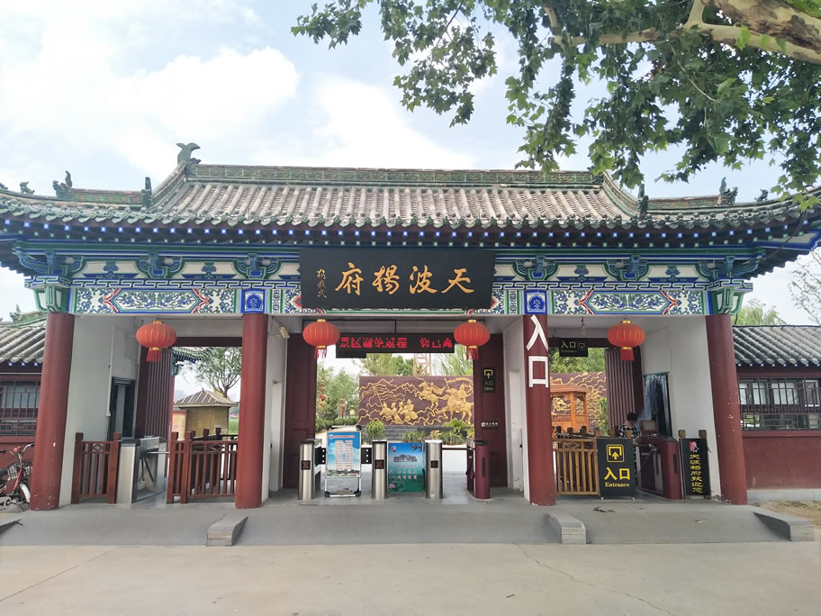 天波楊府是北宋抗遼英雄楊業(yè)的府邸,原位于北宋首都東京(今河南省開封市)城內西北隅、天波門的金水河旁,故名“天波楊府”。天波楊府新址建成于1994年,位于河南省開封市龍亭湖風景區(qū),是一處集湖光山色,歷史文化和宋代建筑群于一體的大型私家園林。天波楊府是依據(jù)《宋東京考》《如夢錄》《祥符縣志》等記載,建于開封市城內西北隅,楊家西湖北岸,東靠北宋皇宮遺址龍亭公園,西臨清明上河園、翰園碑林,占地面積約60000平方米(6公頃),其中水域面積4000平方米,綠地面積26000平方米,仿古建或建筑物占地13253平方米,是一座大型仿宋建筑群,建筑規(guī)格按當時正一品武官級別修成,與楊業(yè)受封太尉和大同節(jié)度使的官職相一致,東靠六朝皇宮遺址龍亭景區(qū),西臨清明上河園,是一座典型的仿宋式古典園林建筑,由楊家府衙,楊家花園,演兵場三部分組成。
