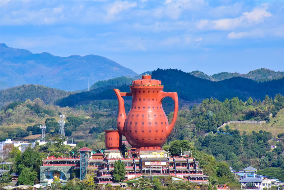天下第一壺茶文化公園位于貴州省遵義市湄潭縣火焰山山頂。其核心景觀'天下第一壺'壺身高48.2米(含基座總高73.8米),獲上海大世界基尼斯總部認(rèn)證的"最大茶壺實(shí)物造型"稱號(hào)。公園占地面積6萬(wàn)余平方米,包含茶文化博物館、中華茶道館、水上樂(lè)園等五大功能區(qū),壺頂設(shè)有射程達(dá)20公里的激光燈形成獨(dú)特夜景。該公園作為貴州十大魅力景區(qū),形成了'一樓一壺一瓶一林'的遵義旅游新格局。