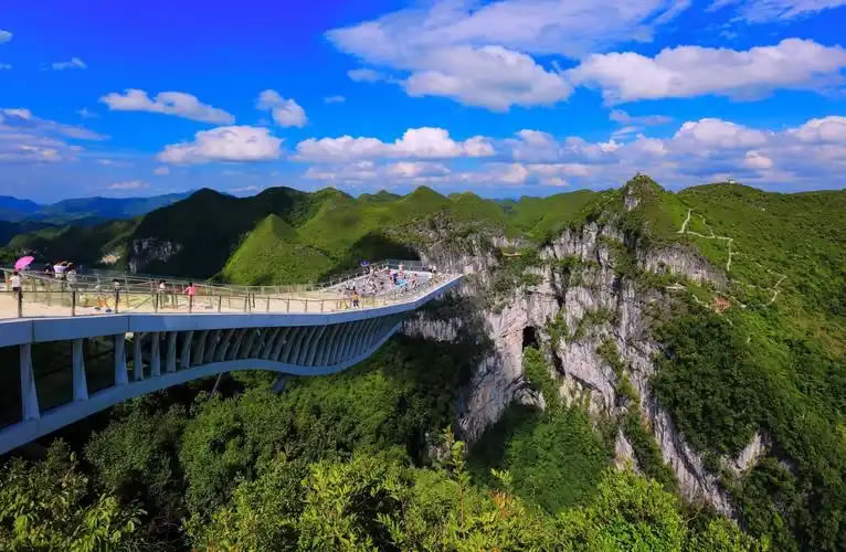 - 云海天舟:世界最長(zhǎng)懸挑玻璃觀景平臺(tái),懸空258米,晴天可見彩虹橫跨天坑,陰天云霧繚繞似仙境。