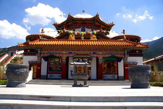 廣宗寺,其整個建筑氣勢宏偉,富麗堂皇。主要建筑有大雄寶殿、大經(jīng)堂、黃樓寺等。其中供奉西藏第六世達(dá)賴?yán)镞z體寶塔的大殿稱為“黃樓寺”。黃樓寺是一座兩層樓閣的建筑,其前部為81間,后部為49間,全部用黃、綠色琉璃瓦砌成,極為富麗。