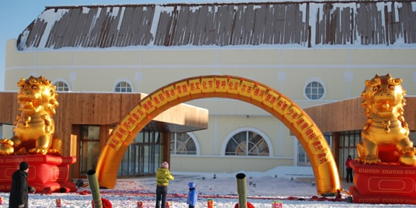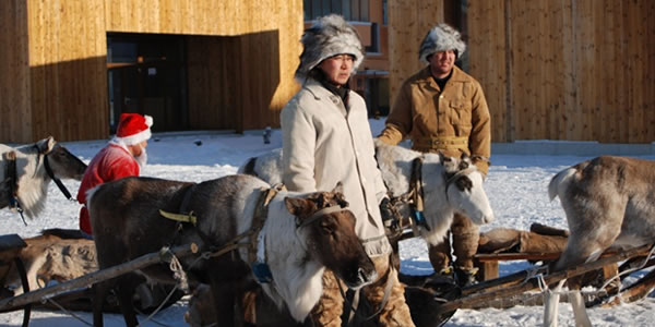 敖 生態(tài)環(huán)境 這里是森林與草原的界線,大興安嶺和呼倫貝爾大草原在這里交匯,一邊是草原、河流,一邊是森林、山崗,空氣新鮮,野味十足,當地人半當真的說"這地方絕對沒有污染,連蒼蠅、蚊子都是綠食食品"。 國家給敖魯古雅鄉(xiāng)人建立了定居地,但馴鹿只能生活在森林里,所以除了在定居點的部分村民,密林中還散布著五個馴鹿站,最遠的在150公里。過去,敖魯古雅人養(yǎng)馴鹿只是作為運輸工具,一頭馴鹿可以負重35公斤左右,每小時可以行走5公里,1964年,取得了割鹿茸成功,F在,馴鹿已經不大用來運輸了,而成了當地人的主要經濟來源,中國唯一的這群馴鹿大約只有10000只左右了。 敖鄉(xiāng)民俗村 敖魯古雅鄂溫克民俗村位于根河市西郊,南臨S301國道,交通十分便利。民俗村總建筑面積58,700平方米,是集大中型會議、休閑度假、民俗展示、娛樂為一體的綜合性旅游度假村,是一處自然——人文旅游 景觀。 民俗村依托森林、河流,鄂溫克獵民的民俗民風,推出一系列具有地方特色的旅游活動項目:主要有森林觀光、探險、模擬狩獵;觀民族宗教、歌舞、民俗表演;品嘗民族風味餐、參觀敖鄉(xiāng)新居、訪獵民等活動;村內建有木質別墅式的游客服務中心,民俗文化博物館、民俗表演平臺、表演廳和餐廳、反映鄂溫克獵民歷史的圖騰廣場、有四十、五十、六十年代不同的撮羅子,有上山索道車、木橋和四處風格獨特的獵民點;還有民俗表演隊和馴鹿車穿行其中,可對敖魯古雅鄂溫克獵民的歷史、文化、宗教、習俗進行了充分的展示。 敖魯古雅鄉(xiāng)距離我國最北端的漠河縣約一百公里左右的路程,位于大興安嶺深處的滿歸林區(qū)。這里氣候十分寒冷,記者走在蜿蜒的山路上,腳下的積雪發(fā)出“咯吱咯吱”的脆響,眼前已是呵氣成冰,身上的棉襖凍得硬梆梆的。隨行的鄉(xiāng)黨委書記鮑玉林說:“現在大約是零下30攝氏度,你們趕上好時候了,往年這個時候得有零下五十度,外面到處冒白煙。” 敖魯古雅鄉(xiāng)有一條主干道,長不過二三百米。道兩邊是整齊的幾排木刻楞房和磚瓦房,象征著主人的富裕程度。敖鄉(xiāng)雖小,卻擁有自己的博物館、學校、文化站和小商店。春節(jié)雖過,但喜慶氣氛尚濃,白雪映襯下,墻上的大紅對聯分外惹眼。 敖鄉(xiāng)生活著近500人,其中鄂溫克人大約有230人。他們現在已經是獵民定居后的第三代了。在離此50到100多公里的山林中,還有四個獵民點,生活著30多名習慣于打獵和在山上飼養(yǎng)馴鹿的老獵民們。