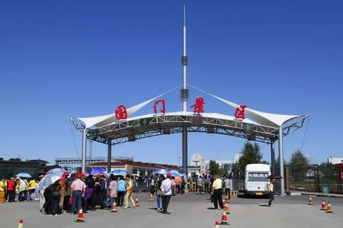 國門莊嚴(yán)肅穆,在國門乳白色的門體上方嵌著“中華人民共和國”七個(gè)鮮紅大字,上懸掛國徽,國際鐵路從下面通過。