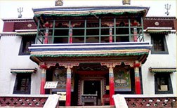 喇彌仁殿(菩提道學(xué)經(jīng)堂),又稱日木倫殿。建于光緒十八年(1892年),位于護(hù)法殿后邊西北高聳的山坡上,為教義戒律學(xué)部,這個(gè)學(xué)部在內(nèi)蒙地區(qū)藏傳佛教寺院中只有五當(dāng)召設(shè)立。是召?gòu)R建筑群中建造年代最晚的建筑物。殿內(nèi)正中供奉銅鑄高九米的黃教創(chuàng)始人宗喀巴坐像。左右兩側(cè)塑其兩大弟子嘉曹杰和克珠杰塑像。兩側(cè)木龕內(nèi)有一千尊一模而成的宗喀巴塑像。二樓凸起的天窗既可容納高大的塑像,又可采納光線,顯示了獨(dú)具匠心的藏傳佛教寺廟建筑特點(diǎn)。