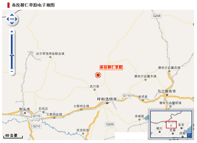 希拉穆仁草原是內(nèi)蒙最早開壁的草原旅游點,在呼和浩特以北100公里處,海拔1700米,丘陵起伏,芳草萋萋,空氣清新,一派草原風光。晝夜溫較大,盛夏之夜,也涼爽似秋。
